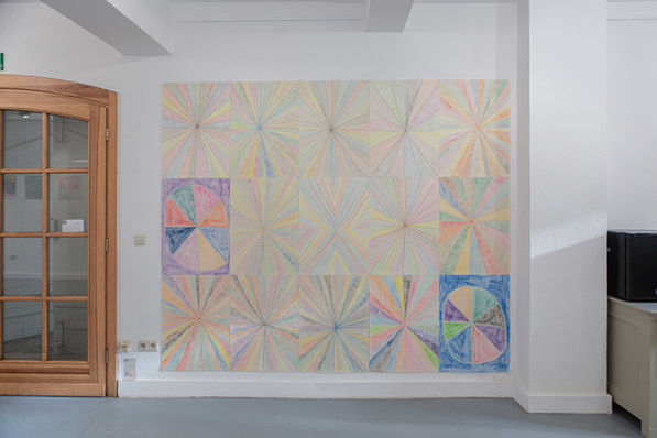 bezeichnet sich selbst als Doppelmalmaschine. Doppelt, weil er doppelt so schnell und doppelt so viel produziert als alle anderen. Sein persönlicher Rekord liegt bei sieben großformatigen Blättern an einem Ateliertag. Und in der Tat: Kraft, Geschwindigkeit, Intensität zeichnen seinen Zugang aus. Aus der Nähe meint man das Tempo der Jumbo Dreikant-Buntstifte zu sehen, den kräftigen Duktus der eng aneinander liegenden Felder aus Parallelschraffuren zu spüren und nachvollziehen zu können, wie die Buntstiftminen schrumpfen; manchmal schaben sich dünne Linien über die Schraffurenfelder, hier blieb keine Zeit zum Spitzen. Löst sich der Blick von der Nahsicht, aus drei bis vier Schritten Entfernung, ist die Bildwirkung eine ganz andere. Von hier aus werden großzügige, mäandernde Formen oder geometrische Kompositionen mit definierten Außenlinien erkennbar, die auch die Blattränder einbeziehen. Das ist zum Beispiel in der Serie Stars der Fall: In den meisten von ihnen ziehen sich vom Bildmittelpunkt aus präzise, freihändig gezogene Linien zu den Ecken und den Rändern des Papiers, es entstehen spitz zulaufende Dreiecke; in Ausnahmefällen umschließen diese zackigen Dreiecke freischwebende ovale Formen vor kräftigem blauem Hintergrund. Aus der Fernsicht wird klar: Die Außenlinien begrenzen die unbändigen Schraffurbewegungen, sie richten sie aus, kanalisieren und leiten sie. Und genau hier, im Spiel zwischen Nähe und Ferne, zwischen Kraft, Geschwindigkeit und Intensität der Schraffurbündel und den mit ruhiger Hand gezogenen Außenlinien entfaltet sich Markus Ruhlands Kunst. Text: Tanja Klemm